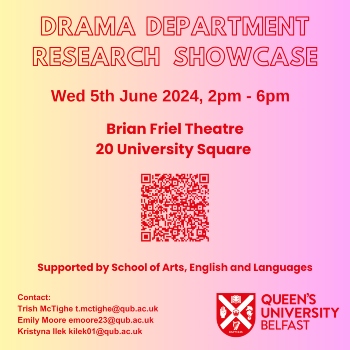 We would like to warmly invite you to our Drama Department Research Showcase 2024. The aim of this Showcase is to learn about each other’s research, to make connections within and outside the department and celebrate the brilliant research that takes place in creative arts at QUB. The confirmed talks focus for example on truth-recovery in Owen McCafferty’s Quietly, on dramaturgy and healthy creative practices, and on narrative literature reviews on youth dance pedagogy.