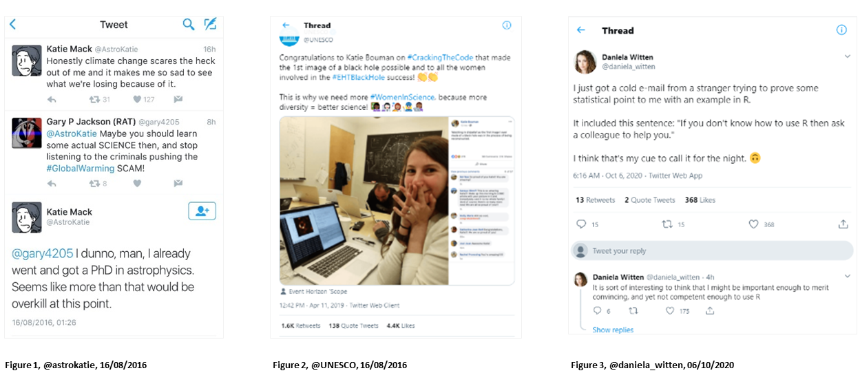 Online, with a wider audience, does our experience differ? How are the confident, competent women of science heard on Twitter? Are our virtual views and contributions welcomed? Well, the good news is, no, we are not avoided. However, the reactions are not always positive.