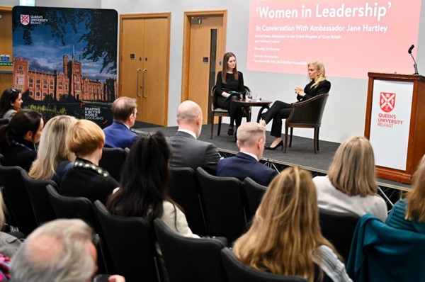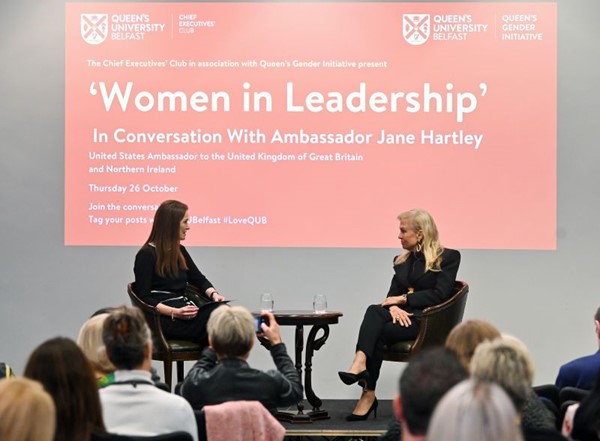 Queen’s Gender Initiative Director Professor Karen McCloskey had the honour of hosting the ‘Women in Leadership’ – In conversation event with US Ambassador Jane Hartley. The inspiring event was organised by The Chief Executive’s Club at Queen's