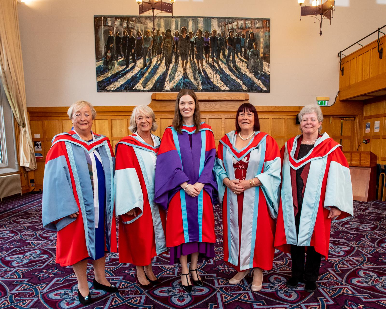 Pictured (left to right) Professor Monica McWilliams (DUniv for services to the local community), Jane Morrice (DUniv for services to the local community), Professor Karen McCloskey (QGI Director), Bronagh Hinds (DUniv for services to the local community) and Pearl Sagar OBE (DUniv for services to the local community).