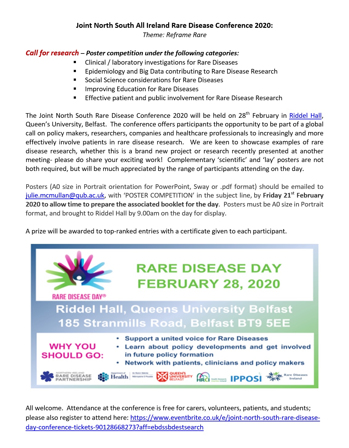 We are very keen to showcase some of the excellent rare disease research ongoing across Ireland and the UK in particular; we are happy to display posters that have been prepared for other meetings in the last year…  We will be preparing a poster booklet for the meeting, so please do help us by forwarding posters at 300 dpi or higher to julie.mcmullan@qub.ac.uk by 21st February 2020.