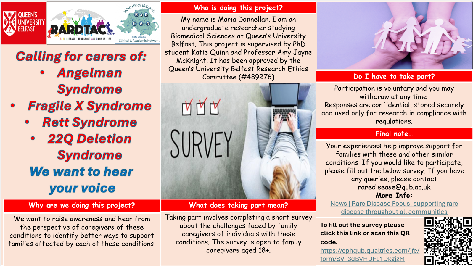 Caring for Fragile X Syndrome, 22Q Deletion Syndrome, Rett Syndrome, and Angelman Syndrome can be extremely difficult. Here in Queen's, we are aiming to explore the impacts of caring for rare conditions in more detail.