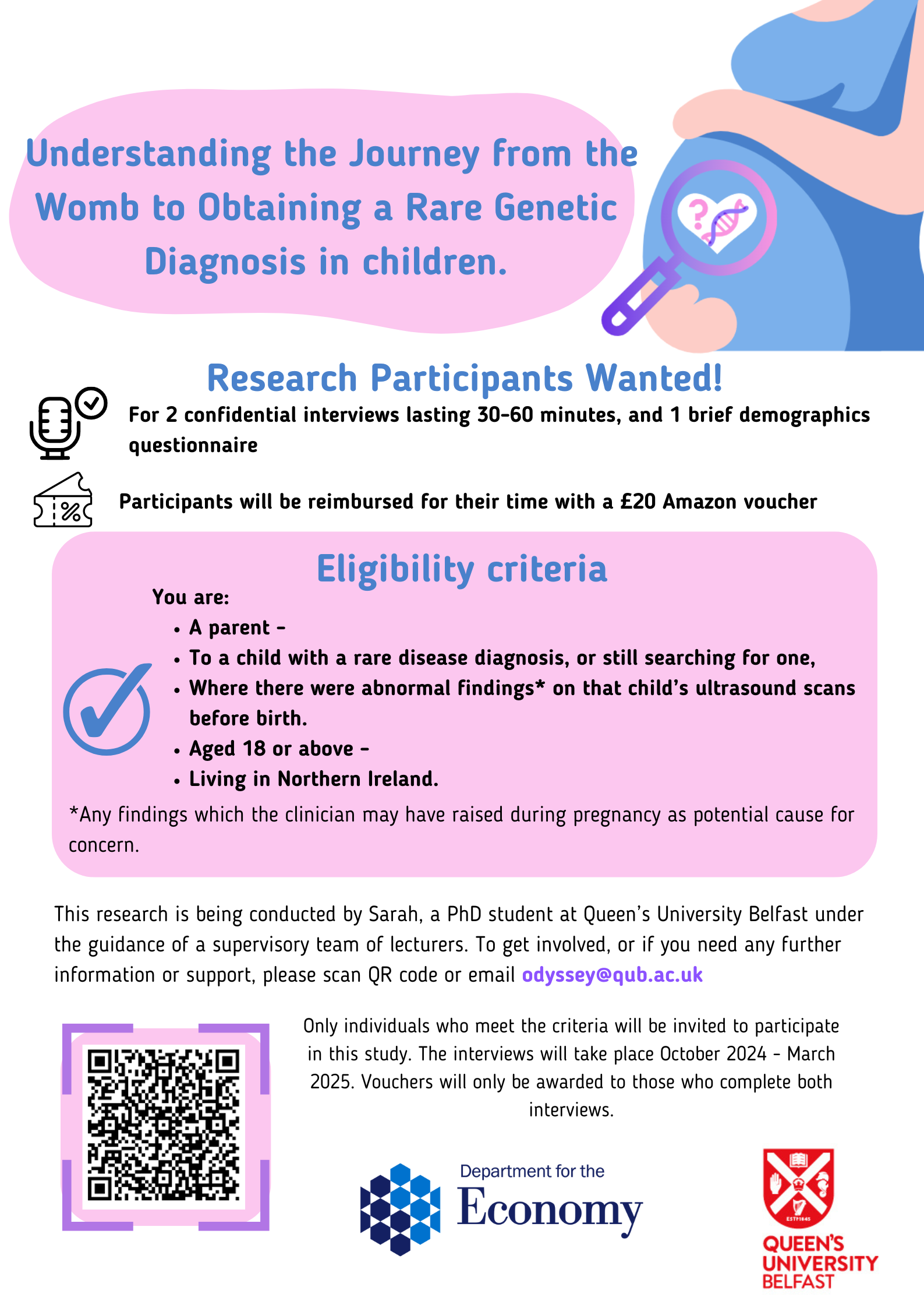 You have been invited to participate as you have self-identified as fitting the study’s inclusion criteria. Specifically, you are over 18 years of age, and you are the parent of a child with a rare genetic disease, diagnosed or undiagnosed, who had unusual findings on their antenatal scans, and you are living in Northern Ireland. If you feel this is incorrect, please inform the research team.