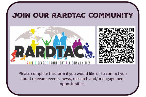 If you are an individual, family, or friend with lived experience who wish to shape rare disease research locally, please join our RARDTAC community and express your interest in PPIE.