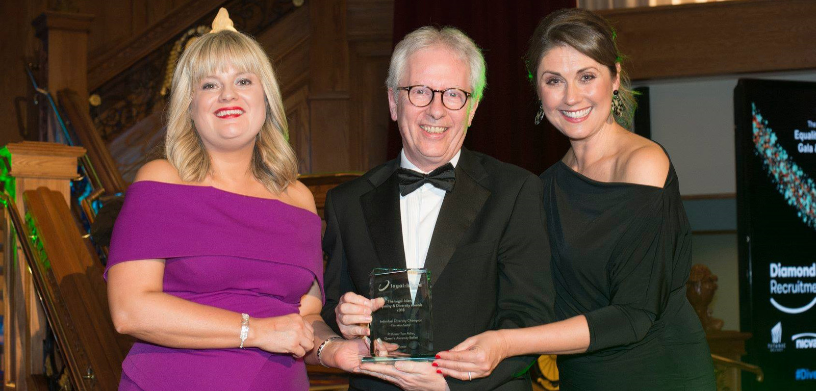 The highlight of the evening was the recognition of work carried out by two Queen's equality and diversity champions, Director of the Queen's Gender Initiative, Professor Yvonne Galligan and outgoing Chair of Athena SWAN, Professor Tom Millar, who were both shortlisted for the same award – Individual Diversity Champion (Education Sector). After collecting his award, Professor Tom Millar thanked all colleagues at Queen's who have led the way, over the years, in progressing a wide range of equality, diversity and inclusion initiatives at the University: