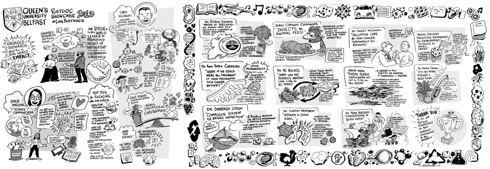 Keynote talks were delivered by musician, radio presenter and award-winning science communicator Emer Maguire, and Chris McCreery, Director of the Northern Ireland Science Festival and Chair of the Cathedral Quarter Arts Festival. Mini Postdoc Pitches followed, with 11 postdocs from all three Faculties giving a glimpse into their respective research areas. The Showcase also included poster presentations and a live illustrator before the awarding of this year's Postdoc Prizes.