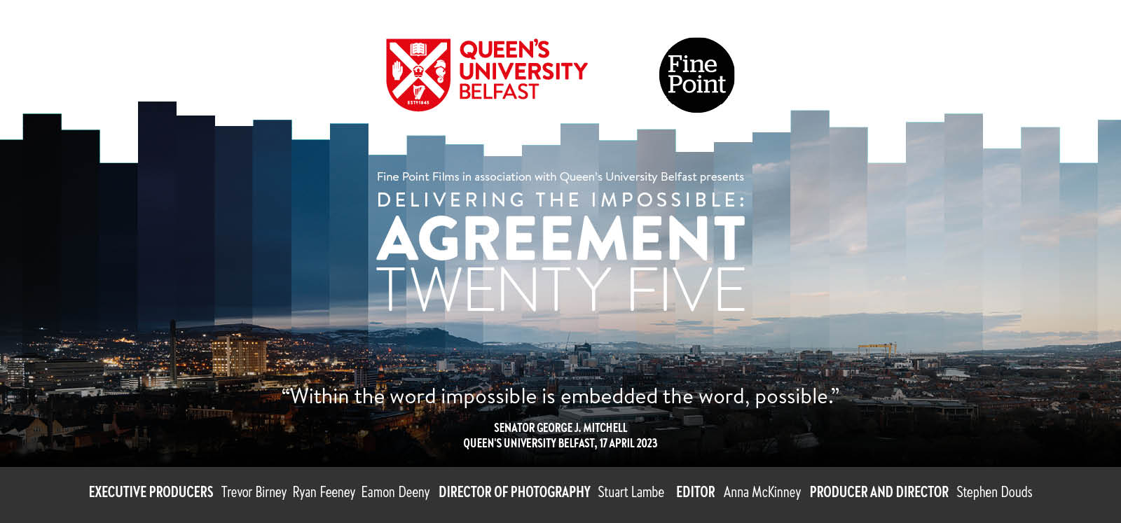 “The successful delivery of the Agreement 25 Conference was a remarkably proud moment for Queen’s. It was an honour to bring together prominent global figures to share their expertise in peace building as we marked the 25th anniversary of the Belfast/Good Friday Agreement. We are therefore delighted to partner with Fine Point Films on a documentary which captures this sense of pride and achievement. It is an important addition to our institutional archive.”