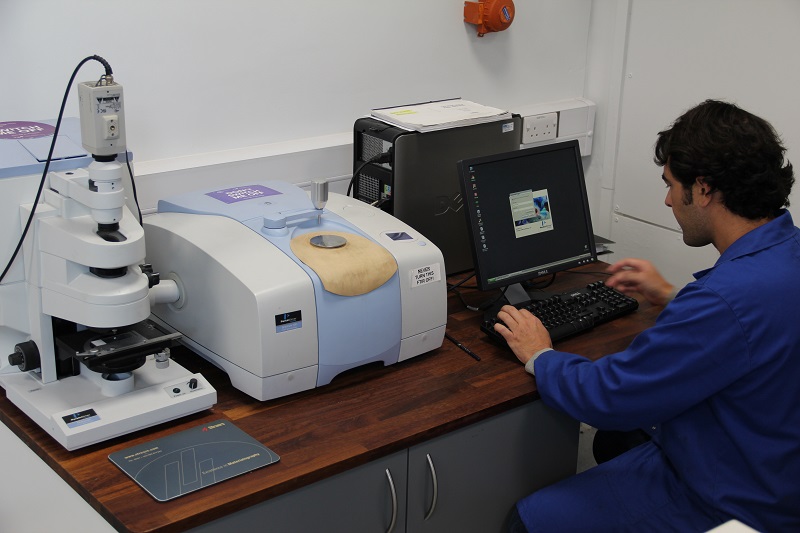 The surface chemistry of the materials (polymers, composites, carbon nanostructures and their modifications) can be studied by means of FTIR spectroscopy (Spectrum 100 FT-IR Spectrometer, Perkin-Elmer). This equipment can analyse the materials in the common transmission or reflection mode, using the Attenuated Total Reflection mode device (ATR).