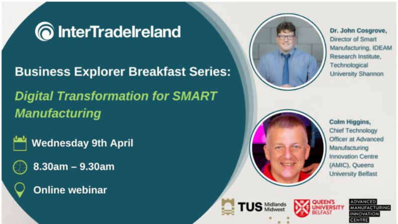 The AMIC team are happy to support the InterTradeIreland Business Explorer team with an exclusive webinar featuring Colm Higgins, CTO, AMIC and John Cosgrove, Director of Smart Manufacturing, Technological University Shannon.