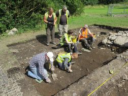The 2018 excavation investigated this area close to the entrance further. Two trenches were opened. Trench 1 revealed a sloped section of masonry and a large pit containing copious amounts of medieval artefacts. Trench 2, located close by uncovered further masonry which probably represented a robbed out wall associated with the Abbey. The artefacts from these trenches indicated the archaeological remains of a thriving monastic community at Cathedral Hill during the medieval period. The animal remains and ceramics confirmed that the features investigated in Trench 1 during the 2018 excavation were midden pits related to the kitchen of the Benedictine Abbey, complementing the interpretation offered during a Time Team excavation in 1997. Due to time and space constraints it was not possible to excavate to the base of the midden pit however environmental samples confirmed that the lowest deposit encountered was 13th/14th Century in date, with some 8th-10th century material surviving which represents residual activity associated with an earlier monastic establishment.