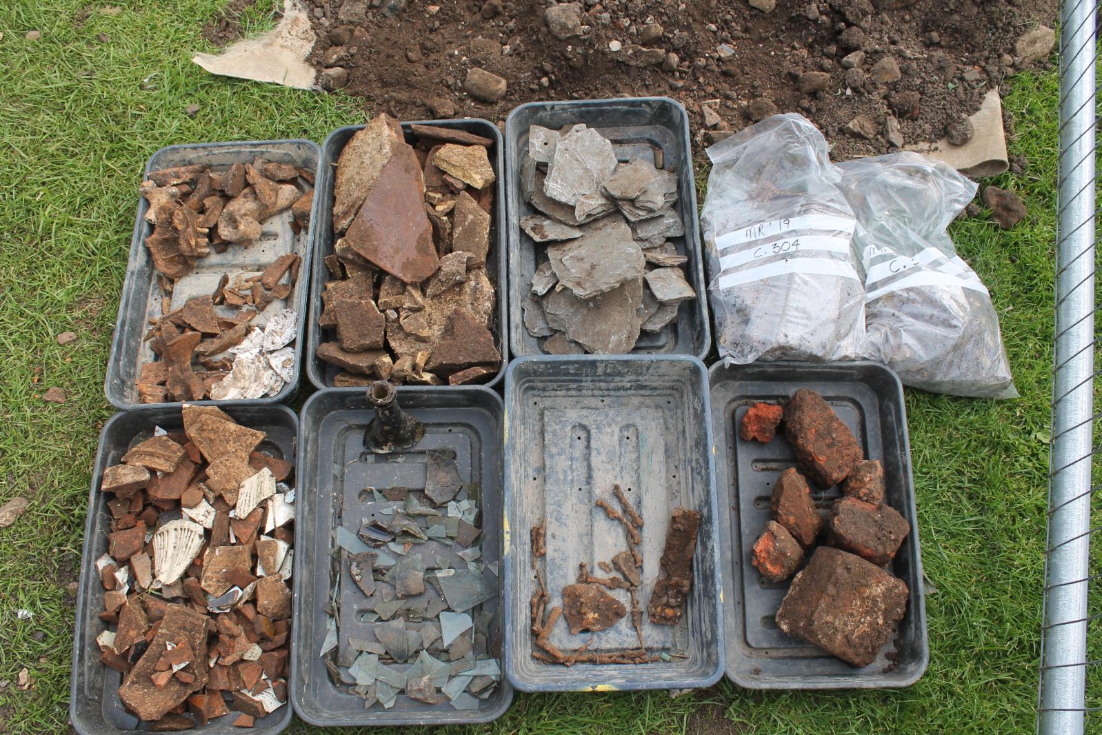 Three trenches were excavated within the demesne. One of the trenches, located in the presumed environs of the Georgian house, uncovered a masonry wall and surface that may be the remains of an ancillary building close to the main house. A second trench revealed levelling deposits elsewhere within the demesne/park. The third, and largest trench, uncovered 18th century clay surfaces, a masonry wall with an associated substantial cobbled surface that included two drains, and a thick midden deposit. These features all relate to an 18th century building within the demesne, possibly a stable block. Among the 18th century finds recovered from the excavation were a coin from 1773, glazed pottery, floor and roof tiles, window and bottle glass, perforated roof slates, iron nails and other metalwork, fragments of clay tobacco pipes, and animal bones and oyster shells (the remains of people’s meals). At the limits of the large trench, below the demesne horizons, a portion of a large ditch from an earlier period of human activity on the site was uncovered. The ditch might either be part of a defensive feature or possibly a property boundary. Charcoal was obtained from the ditch fills and it is hoped that a date for the feature can be obtained in the near future.