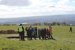 In April 2016 the Centre for Archaeological Fieldwork (CAF)was commissioned by Cultúrlann McAdam Ó Fiach and the Spectrum Centre to devise and lead a two-week community-based archaeological fieldwork programme on their behalf as part of the Farset Heritage Project, funded by the Heritage Lottery Fund. The site selected for the investigation was on the south-facing slope of Squire’s Hill on the outskirts of Belfast, in the townland of Ballysillan Upper and in the parish of Shankill. The dig was directed by Ruairí Ó Baoill and took place between 18th and 29th April 2016.