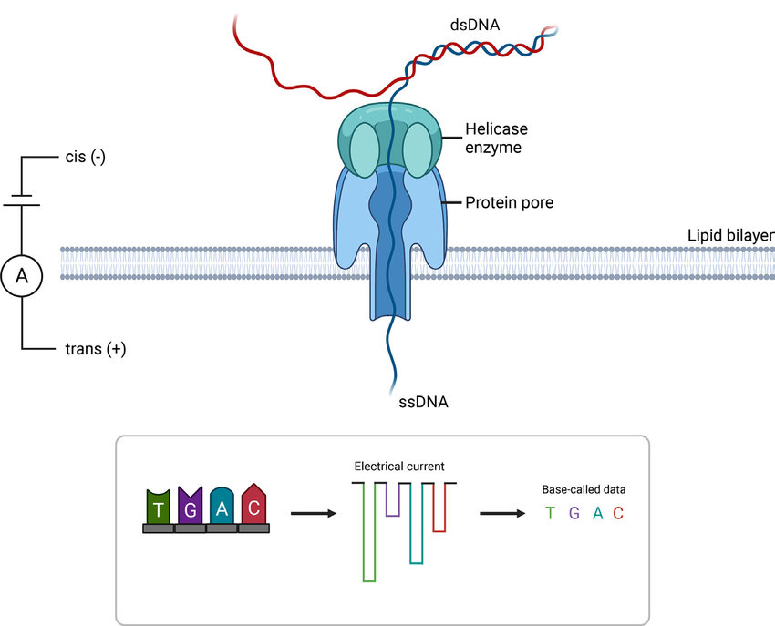 - Technology: Passes single-stranded DNA or RNA molecules through nanopores embedded in a membrane. As the molecules move through the nanopore, changes in the ionic current are measured and interpreted as nucleotide sequences.