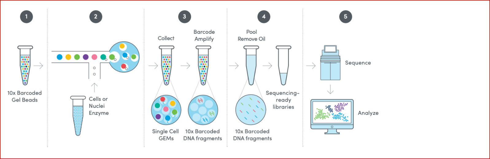 10X Genomics single-cell RNA-seq workflows are designed to analyze gene expression at the single-cell level. The process begins with cell isolation and barcoding using the Chromium X instrument, where each cell's RNA is captured and labeled with a unique barcode. Downstream sequencing libraries are prepared from the cell barcoded RNA and subjected to standard sequencing methods. Sequencing reads are then processed using the Cell Ranger pipeline, which includes steps like alignment to a reference genome, UMI counting for gene expression quantification, and identification of true cells versus background. The resulting gene expression matrix is used for downstream analysis, including cell clustering, visualization, and differential expression, providing detailed insights into cellular heterogeneity.
