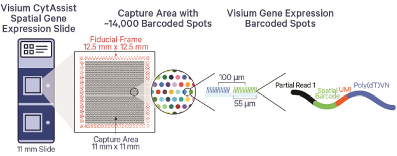 - Standard Visium: resolution around 55µM, 2 capture areas per slide at 6.5x6.5mm or 11x11mm