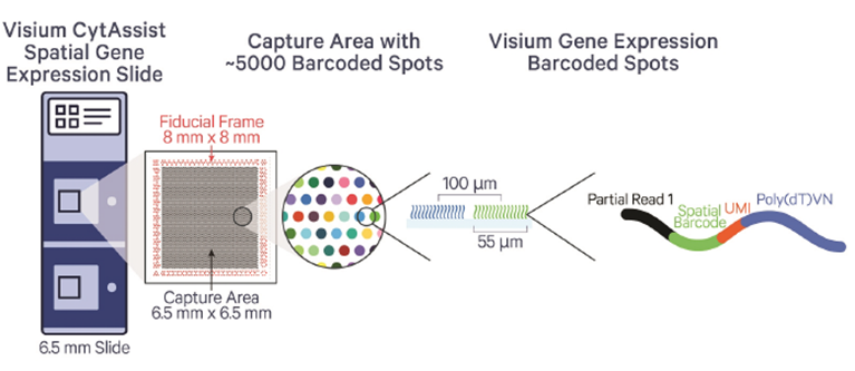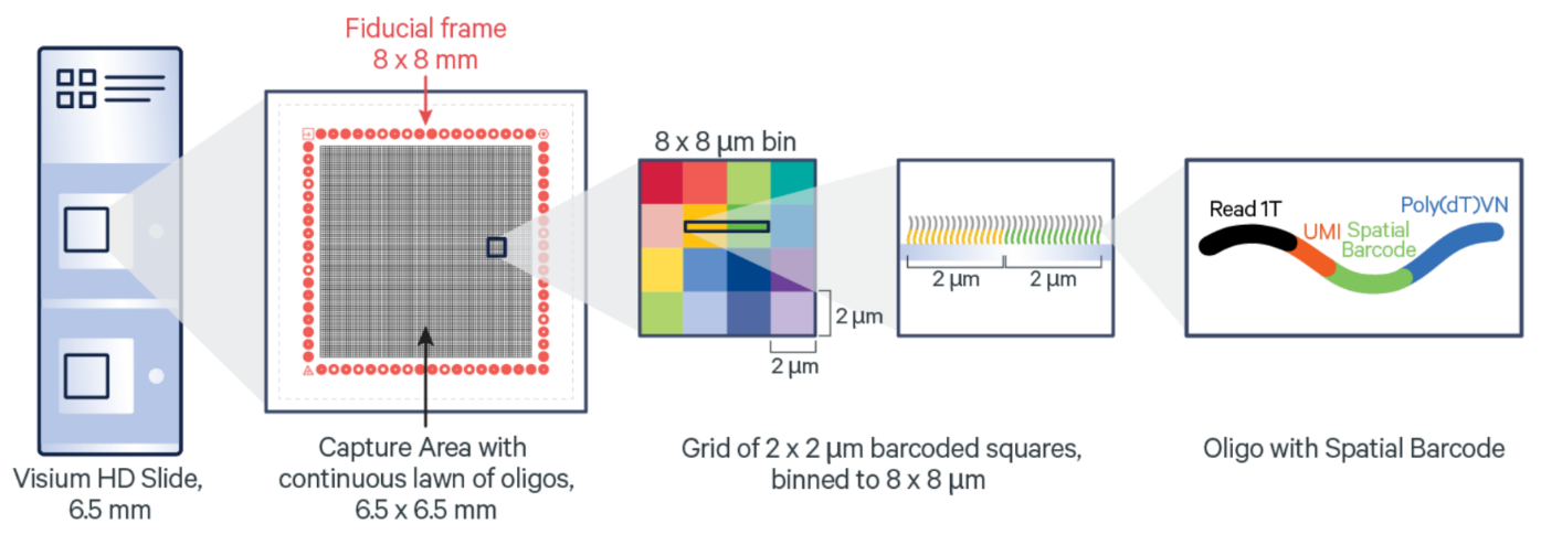 - VisiumHD: resolution 2µM (binned to 8µM), 2 capture areas per slide at 6.5x6.5mm