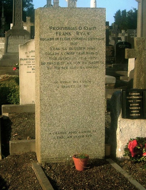 In 1979 Ryan’s body was exhumed, in a ceremony conducted with full military honours, from its place of burial in communist-East Germany and reinterred in the Republican Plot in Glasnevin. His burial was attended by leaders from every shade of Irish republicanism, and described by the Irish Times as ‘an event of historic importance’. In 1980 an influential biography of Frank Ryan, written by former IRA chief of staff Sean Cronin, exonerated Ryan from the charge of collaboration: ‘He worked for no one. He was his own master’. This view of Ryan as a victim of circumstances – or even a prisoner of Nazi Germany – came to be widely accepted by Irish republicans for whom the IRA’s collaboration with Nazi Germany remains a chapter of history best forgotten.