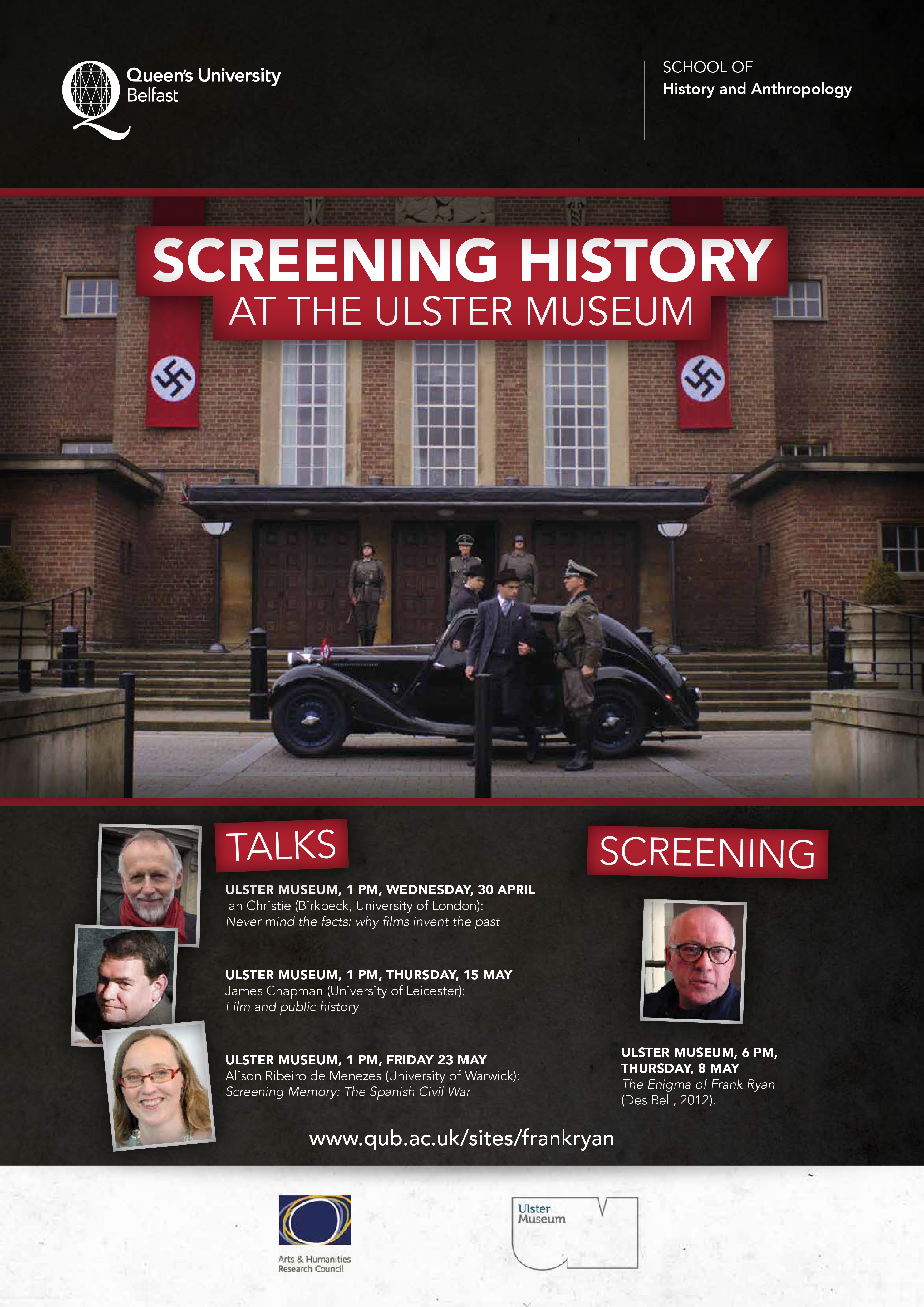 We are pleased to announce the dates of our 'Screening History' series, hosted by the Ulster Museum. 'Screening History' presents talks and screenings by leading scholars and filmmakers, exploring the topic of film and historical representation. All events are free and open to the public.