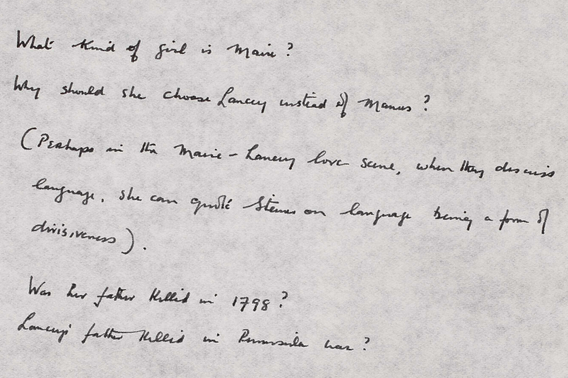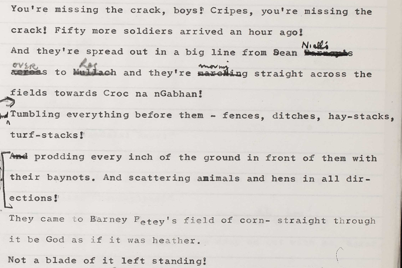 Part of the scene’s effectiveness comes from the lovers’ attempts to communicate despite speaking different languages: Maire speaks Irish and George, English. The scene famously culminates in an exchange of place-names but Friel’s papers reveal he danced around several ways of staging the couple’s growing feelings for one another. An early thought included, ‘a MIME because of language difficult’ (BFDA MS 37,085.1.2.7).