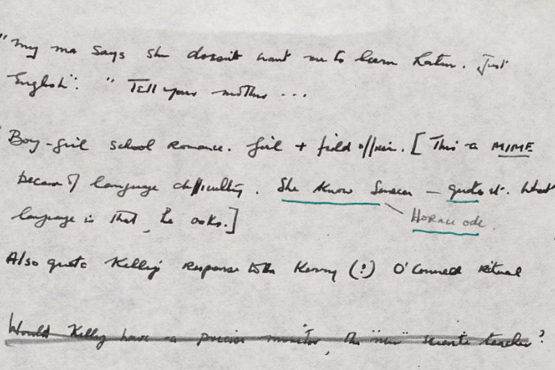 In these archival holdings we find references and copious notes to John Andrews’s study of the Ordnance Survey in Ireland, A Paper Landscape (BFDA MS 37,085.1.7; Patrick John Dowling’s history of The Hedge-Schools of Ireland (BFDA MS 37,085.1.10); and George Steiner’s exploration of language and translation, After Babel (BFDA MS 37,085.1.8).