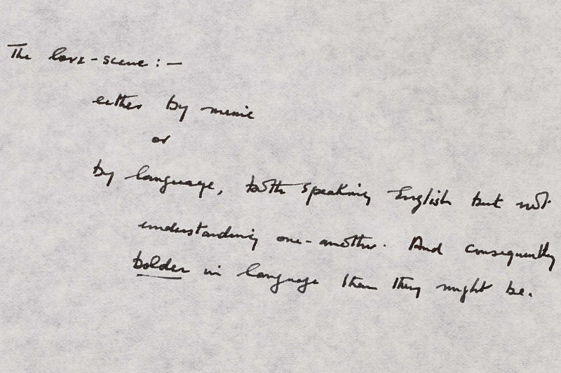 A later idea for the ‘love-scene’ was to stage their deepening love ‘either by music or by language, both speaking English but not understanding one-another. And consequently bolder in language than they might be’ (BFDA MS 37,085.1.3.4). Friel went with this second idea including the notion that they might be ‘bolder’ because they couldn’t speak the same language. Both Maire and George are more confident with their feelings in this scene than anywhere else in the play. They both say to the other ‘Say anything at all. I love the sound of your speech’. Maire is the most assertive, though, with her articulation of a very taboo desire: ‘I want you too, soldier’.
