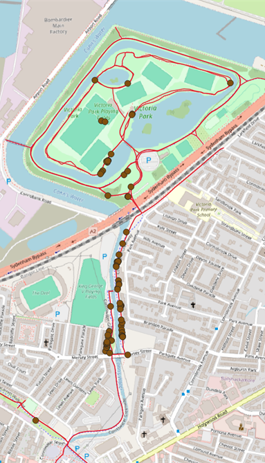 We’ve identified consistent hotspot areas along the path between CS Lewis Square and Victoria Park. In total there have been over 500 recorded instances of dog fouling along this stretch of 500m path. Furthermore, we can see that the dog foul is found most frequently closer to entrances and in grassy, hard-to-see areas. This suggests that targeted interventions could make a real difference in these zones. With these findings in hand, the next steps will focus on understanding why fouling is concentrated here and how we can work with the local community to reduce it.