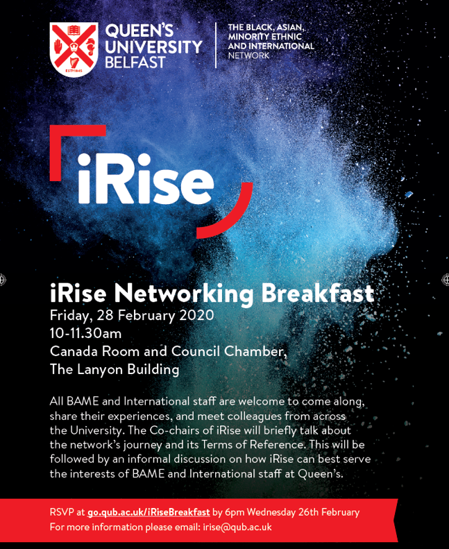 All BAME and International staff were welcomed to come along, share their experiences, and meet colleagues from across the University. The Co-chairs of iRise briefly talked about the Network’s journey and its Terms of Reference. This was followed by an informal discussion on how iRise can best serve the interests of BAME and International staff at Queen’s.