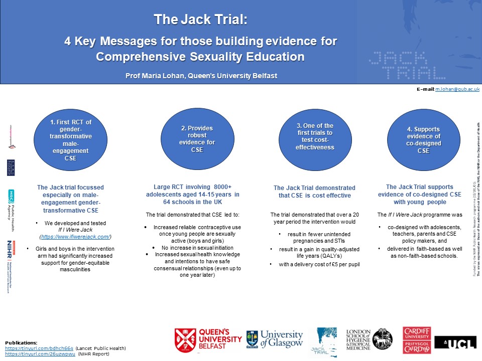 Prof Maria Lohan presented the results of the Jack Trial at the 26th Congress of the World Association for Sexual Health in November 2023, highlighting four key messages for those building evidence on comprehensive sexuality education (CSE):