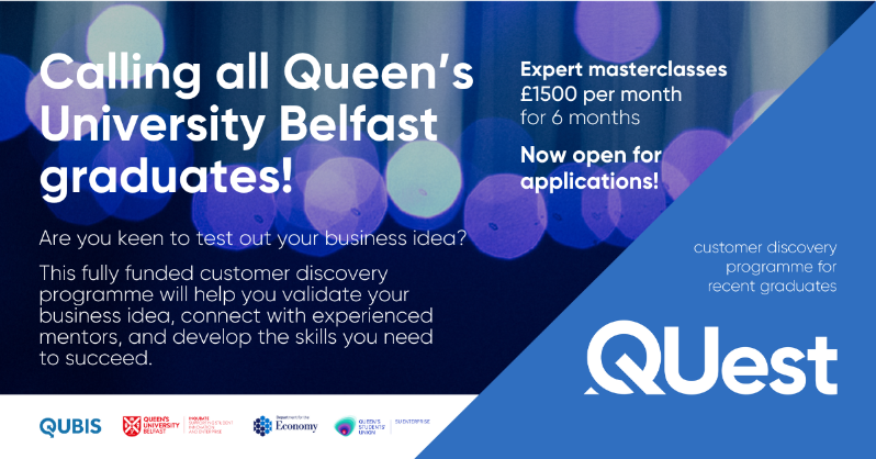 The QUest Customer Discovery Programme supports early-stage entrepreneurs in validating and developing their business ideas. Designed for Queen’s University Belfast graduates, it provides guidance, mentorship, and resources to help turn innovative ideas into viable ventures.