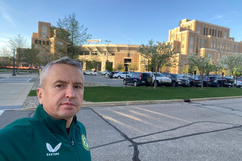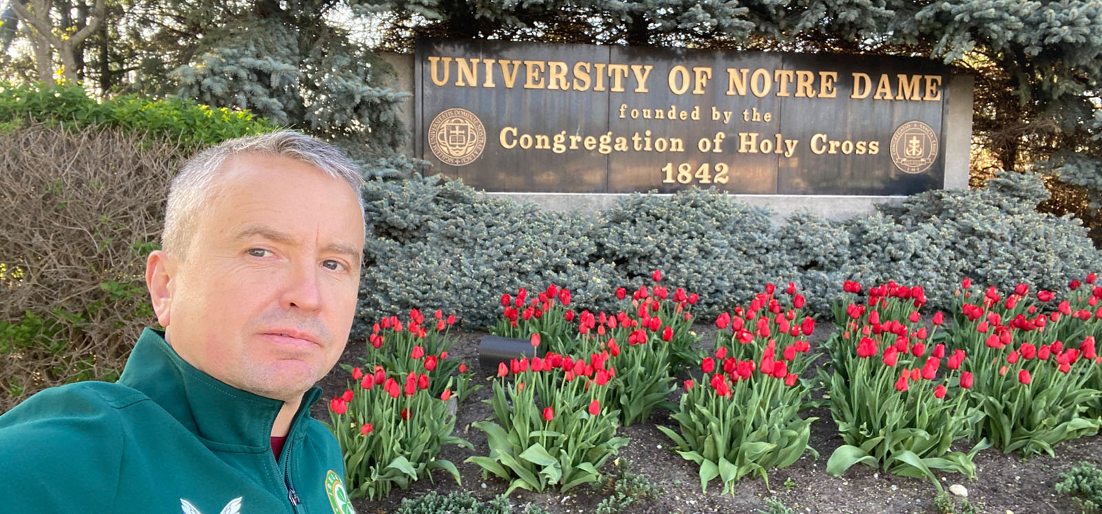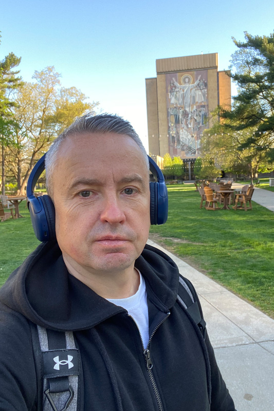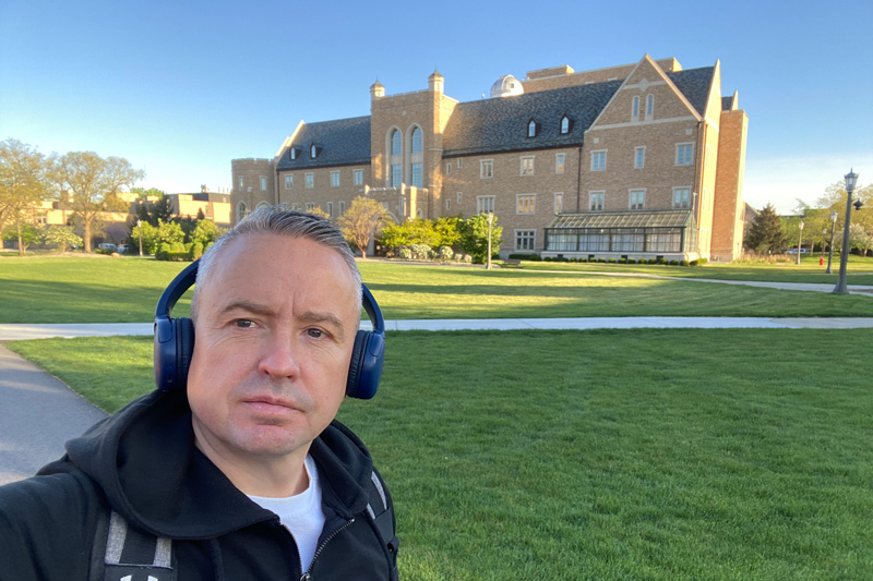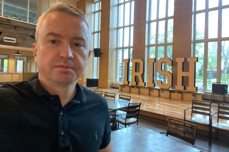Whenever I had the chance (and in between rain showers), I took the opportunity to experience and explore the campus itself—which is among the most iconic and picturesque in the United States.  Spanning over 1,250 acres, its architectural landmarks include the Golden Dome, the Basilica of the Sacred Heart, and the famous Hesburgh Library with its towering ‘Touchdown Jesus’ mural, which, despite being busy with students cramming for exams, served as a peaceful study environment during my stay.  The grounds also feature two lakes, a golf course, a performing arts centre, several museums, Harry Potter-style dining halls, and a scaled-down replica of the Grotto of Our Lady of Lourdes.  The University’s world-famous ‘Fighting Irish’ sporting culture is also visible everywhere—from the 80,000-seat football stadium to the numerous state-of-the-art facilities for baseball, lacrosse, basketball, tennis, rugby, and even real football.