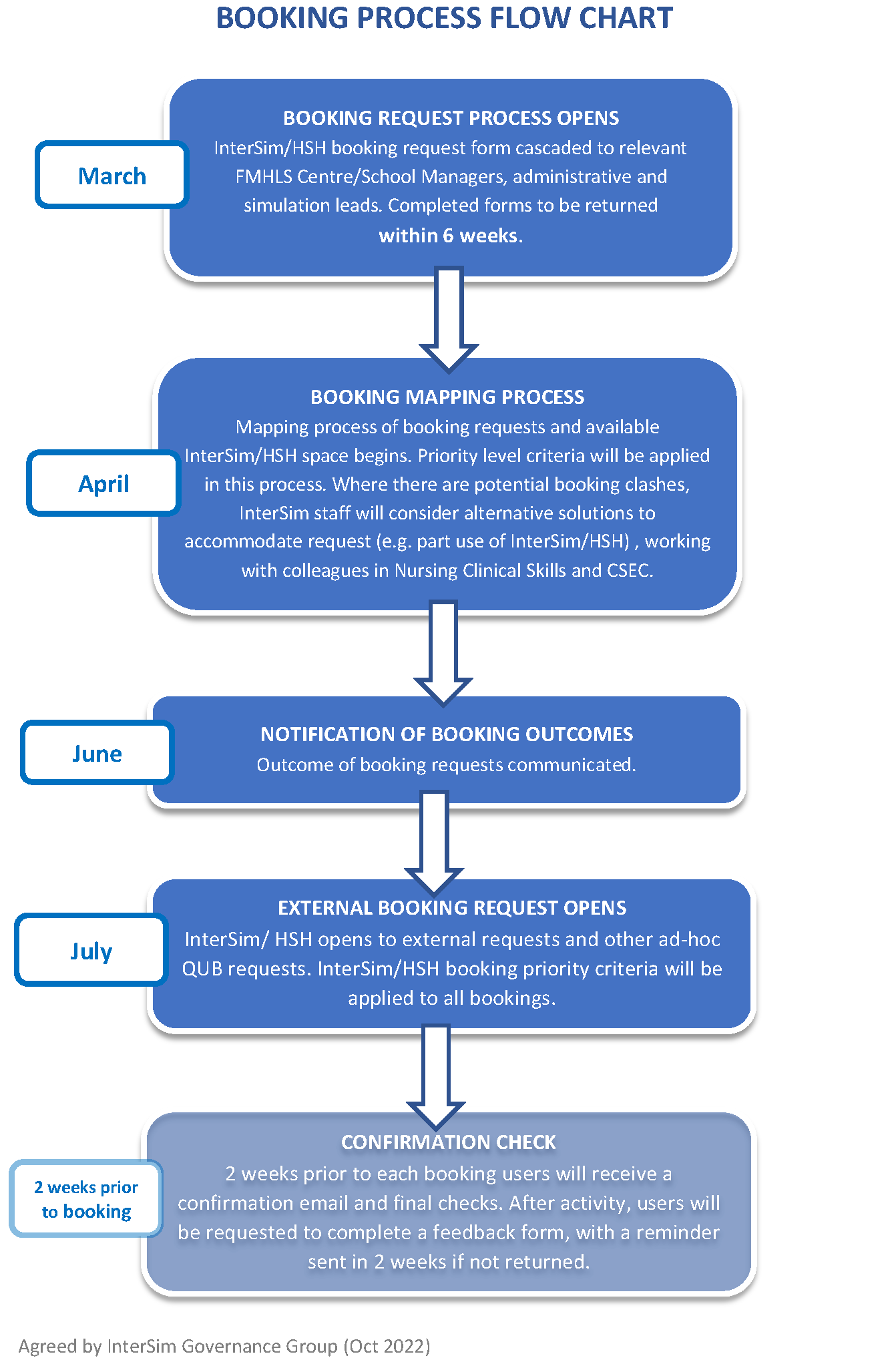 InterSim and the Healthcare Skills Hub (HUB) are specialised facilities in FMHLS with the key aim of supporting health professional staff to deliver high-quality experiential education. This document outlines the booking process for activity in these facilities. While our priority is to accommodate QUB educational bookings, we are also open to and encourage requests for external bookings. Booking arrangements for InterSim and HUB are as follows.