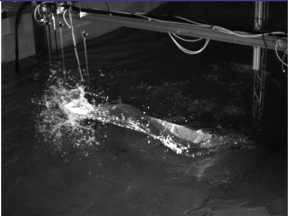 Figure 1: Simulation (left) and physical experiment (right) of a flap type wave energy converter in extreme seas.
