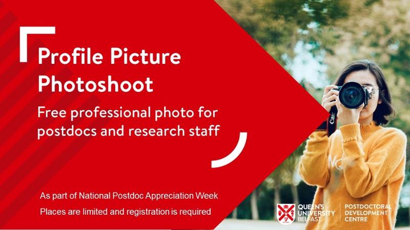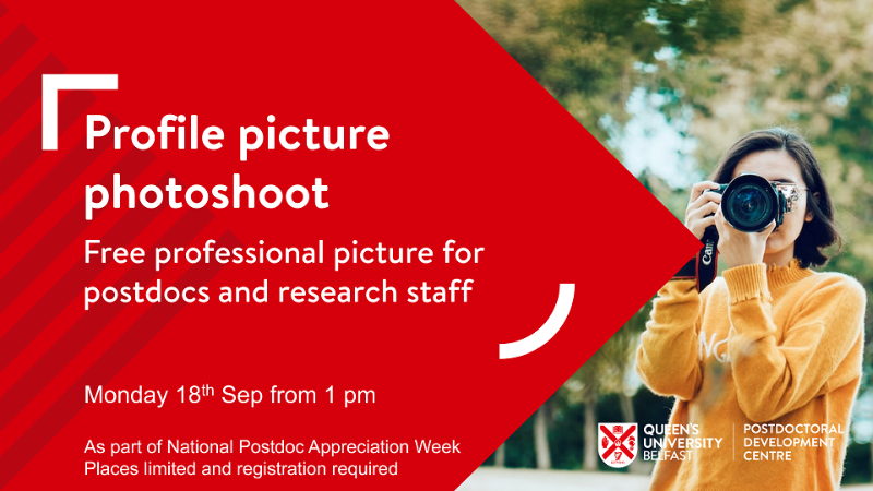In celebration of National Postdoc Appreciation Week 2024, the PDC will be offering Queen's research staff the opportunity to have their photograph taken by a professional photographer, to use for professional profiles (e.g. Pure profile, LinkedIn profile, research group website, etc.).