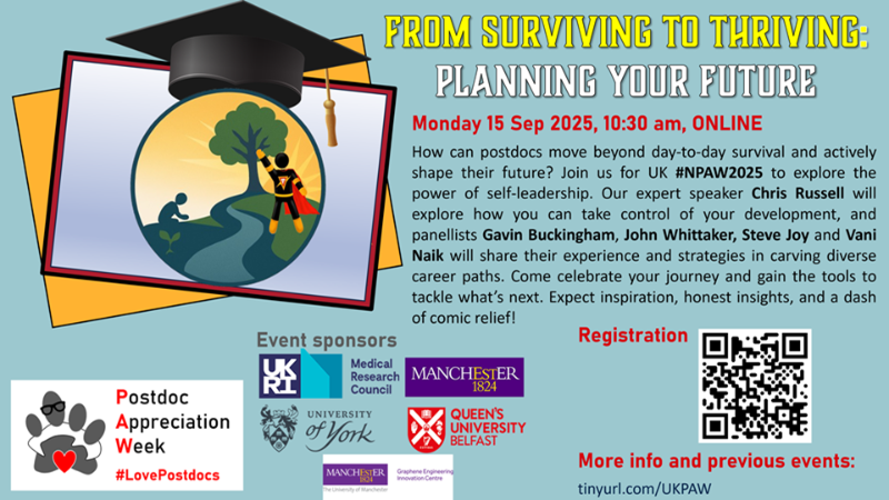 Join postdocs from across the UK for this year’s online flagship event celebrating National Postdoc Appreciation Week (NPAW). This free session offers an inspiring opportunity to connect, reflect and explore the power of self-leadership in research and beyond.