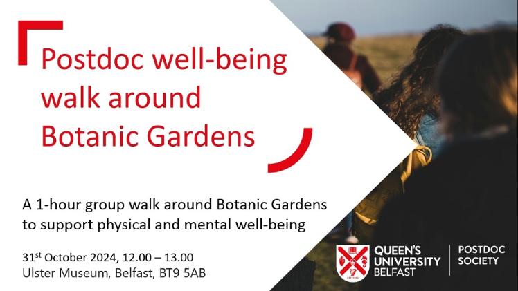 The Postdoc Society is led by and made up of Postdoctoral Researchers from across Queen's University Belfast. It was established in October 2022 to support Postdocs and Research Staff during their time at Queen's.