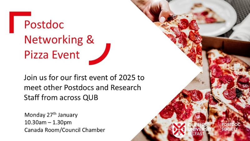 The Postdoc Society invites all Postdocs and Research Staff at Queen’s to an informal networking event on 27 January.  To offer the maximum opportunity to connect with other postdocs and talk about your research, we will have small group activities as well as presentations to the group.  There will also be a presentation from Dr Úna McMenamin, Centre for Public Health at 12:30 pm relating to her journey from Postdoc to Senior Lecturer, and being a Future Leaders Fellowship holder.