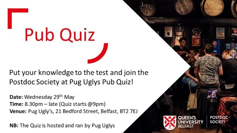 Put your knowledge to the test and join the Postdoc Society at Pug Uglys from 8.30 pm - late on Wednesday 29th May for a pub quiz and a chance to network with other postdocs and research staff.