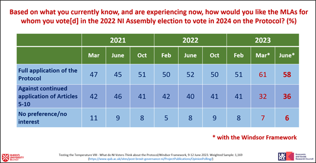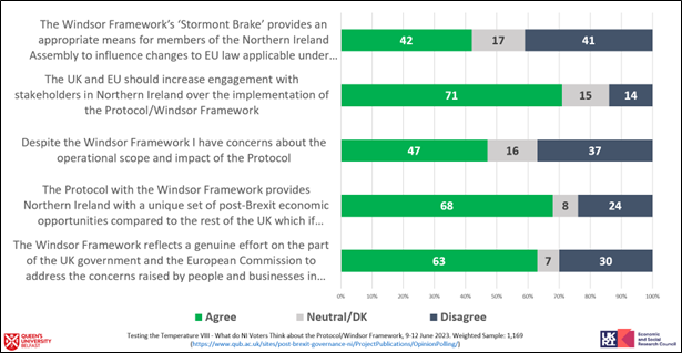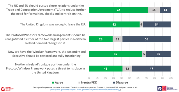 Our previous regular polls were conducted in a context of ongoing contestation around the Protocol and often strained UK-EU relations. This poll took place against the backdrop of significantly improved UK-EU relations, UK-EU adoption of the Windsor Framework, and early signs of constructive engagement over its implementation. The UK Government indicated that it viewed the Windsor Framework as the best possible deal it could secure and it was thus not open to any renegotiation with the EU.