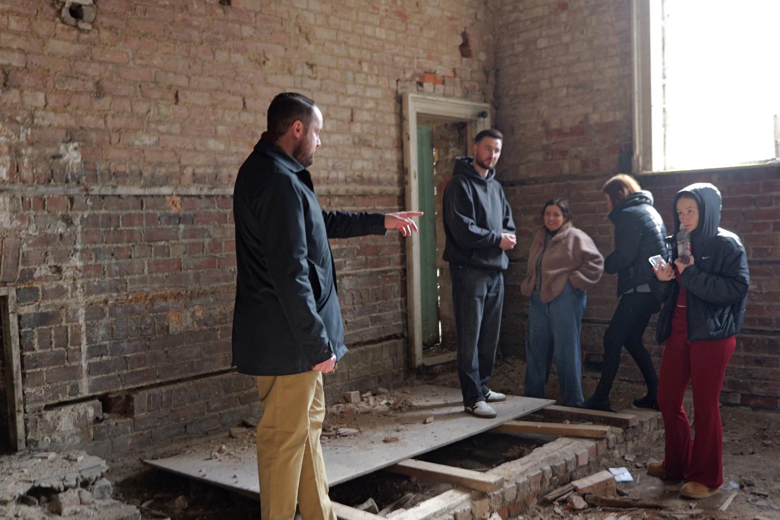 Following an architectural overview delivered by Richard Spence, the group undertook a guided site visit of the convent school itself, allowing stakeholders to move through the building directly and develop a grounded sense of its spatial potential and current condition. Subsequent sessions explored emerging heritage-led design concepts alongside critical questions of financial feasibility and planning consideration. Professor Brendan Murtagh (Queen's University Belfast) presented an analysis of potential social return on investment, connecting the site's regeneration prospects to the broader evidence base on community wealth building and social infrastructure.