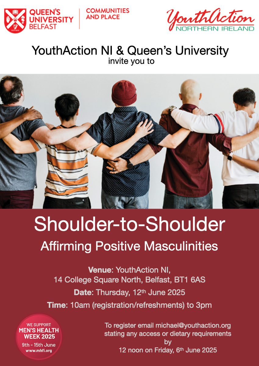 On 12 June 2025, QCAP research fellow Dr Amanda Dylina Morse partnered with Michael McKenna at YouthAction NI to host Shoulder-to-Shoulder, a seminar on working with young men and affirming positive masculine identities.