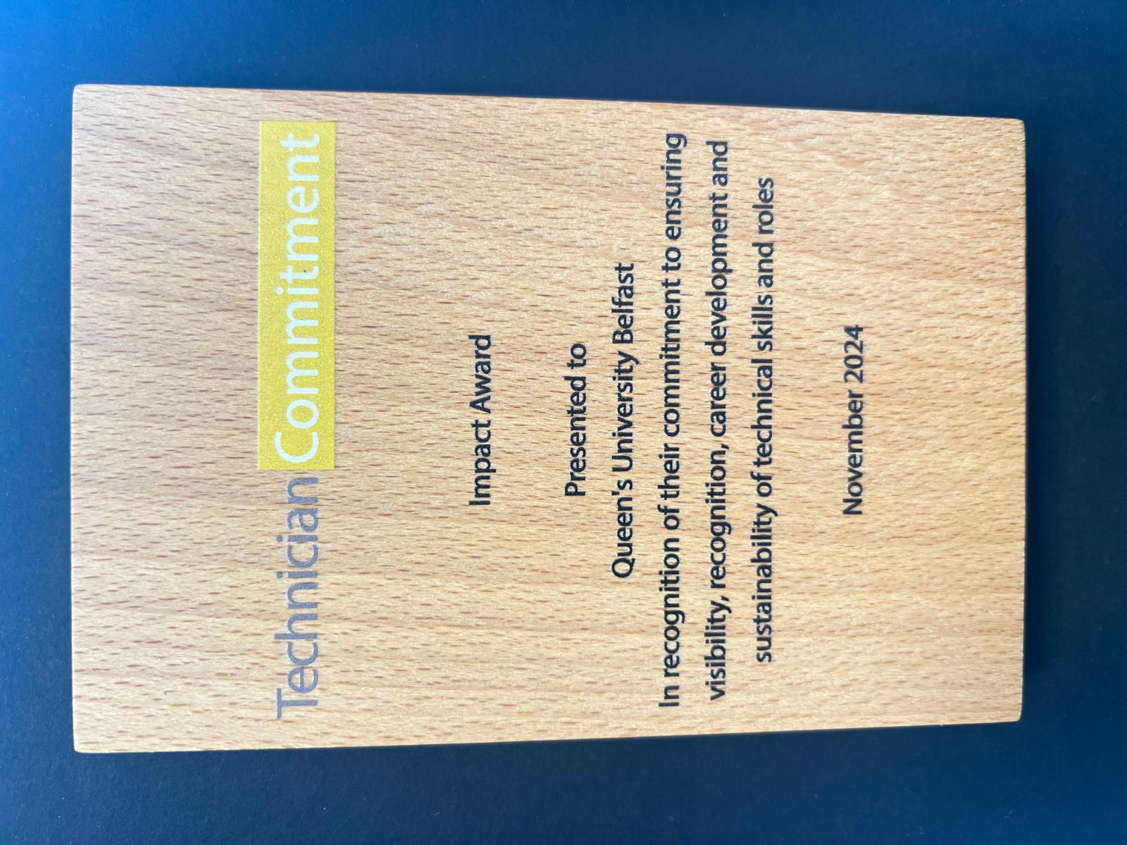 Queen's University Belfast received an Impact Award for the work that has been done by all Technician's.