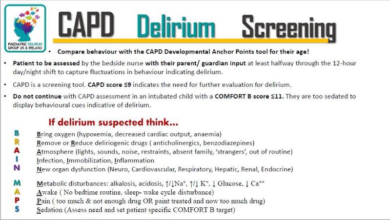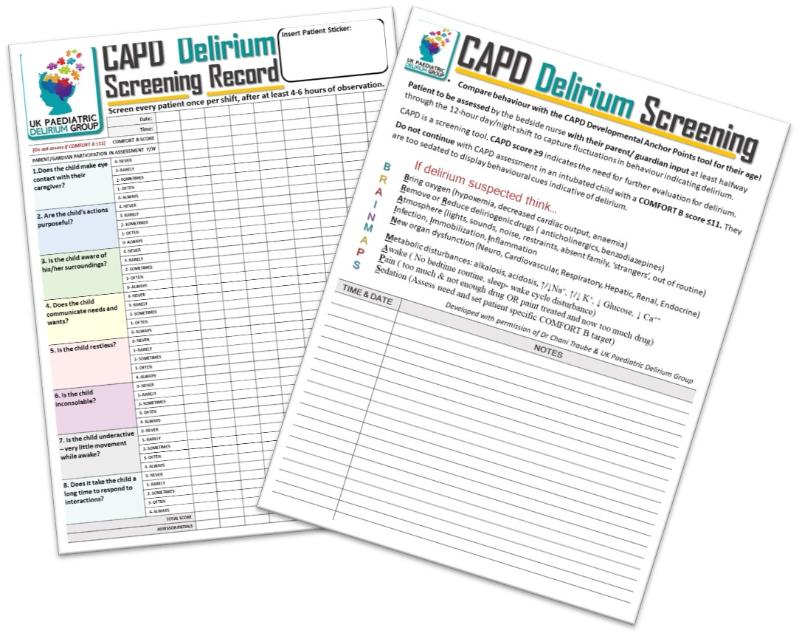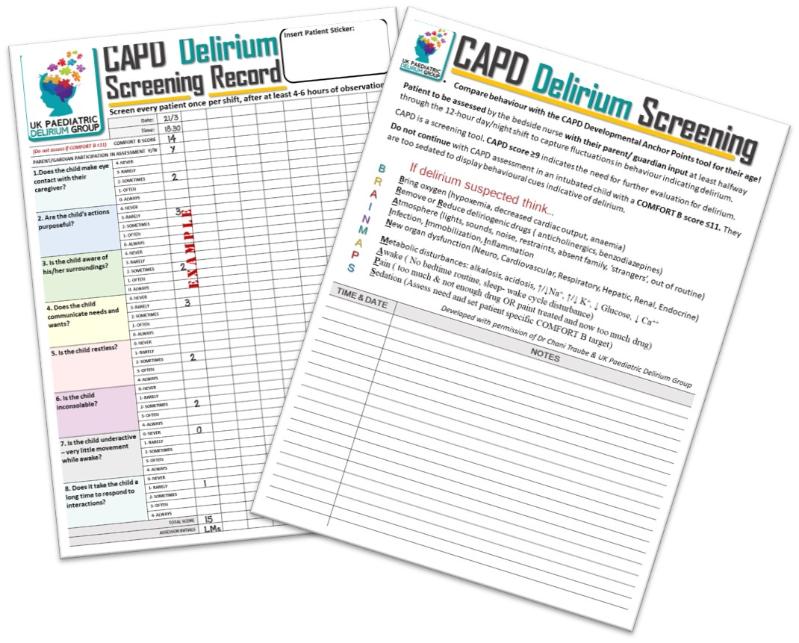 The CAPD Record sheet has all points of the screening tool to the front and factors to consideration eliminating when delirium is suspected.